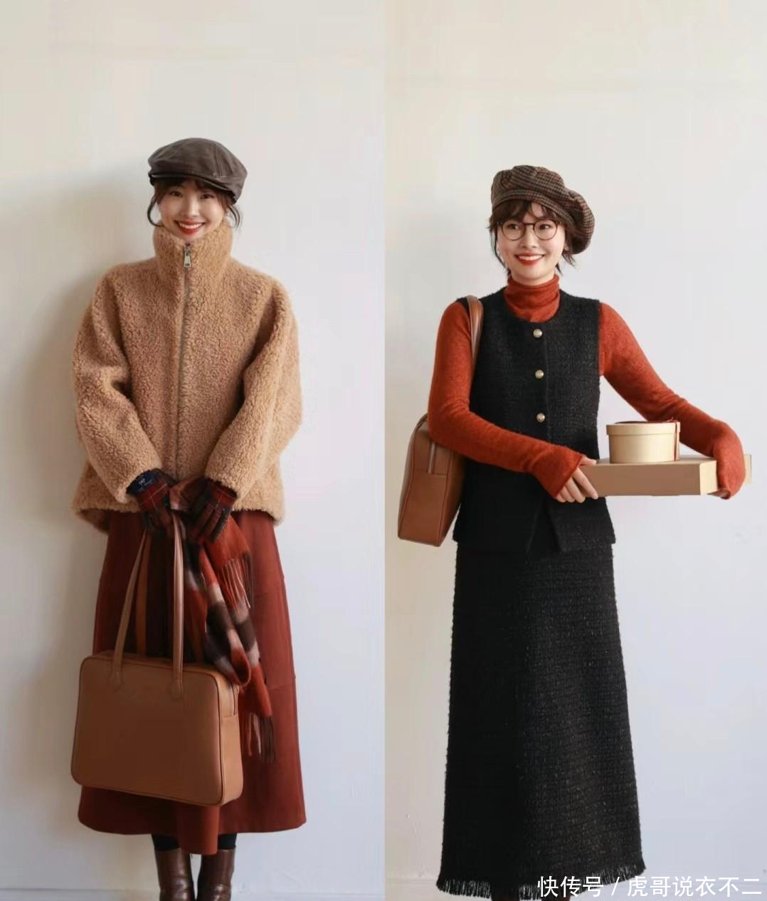 当然,如果想要在冬日里展现出一种喜庆而明媚的气质,那么红色与大地色的组合则是不二之选。短款的大地色大衣搭配大红色的裙子,不仅让整体穿搭更加鲜明而抢眼,还能在视觉上提升女性的气色与精神状态。这种配色不仅适用于节日庆典等场合,更能在日常生活中为女性增添一份自信与魅力。
